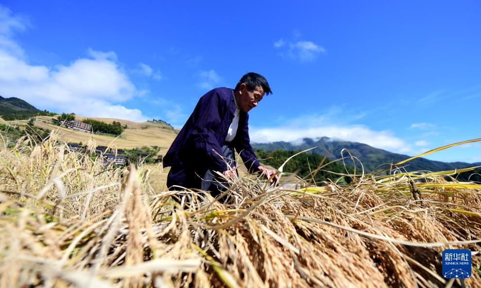 龙吉梯田的水稻收割