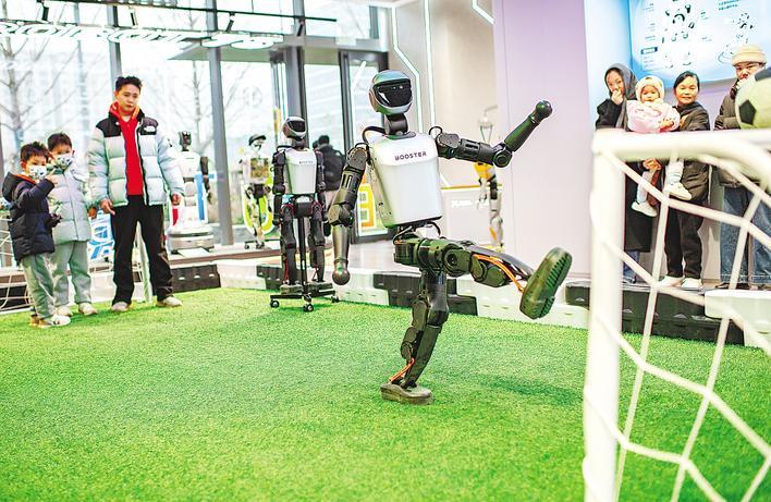 12月20日,在光谷人形机器人7S店,一名男孩在教练的指导下与人形机器人踢足球。