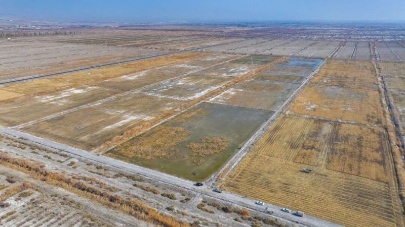 今年,223团海水稻亩产达到500公斤。这是海稻收割场景的航拍照片。图/铁门关在线微信公众号群223位于天山...